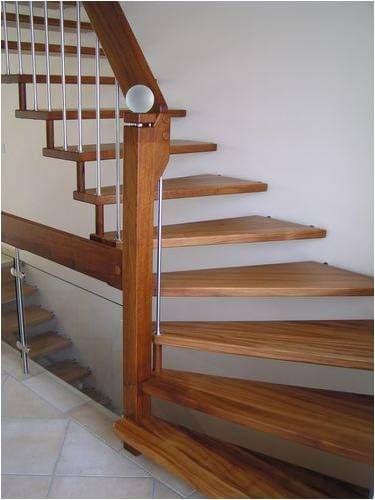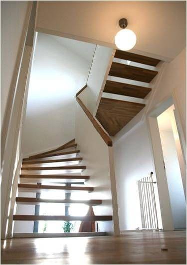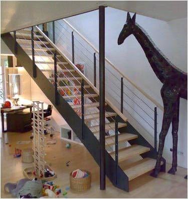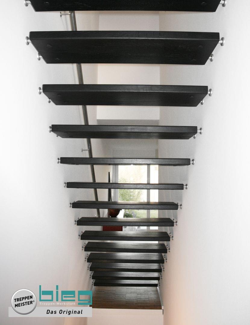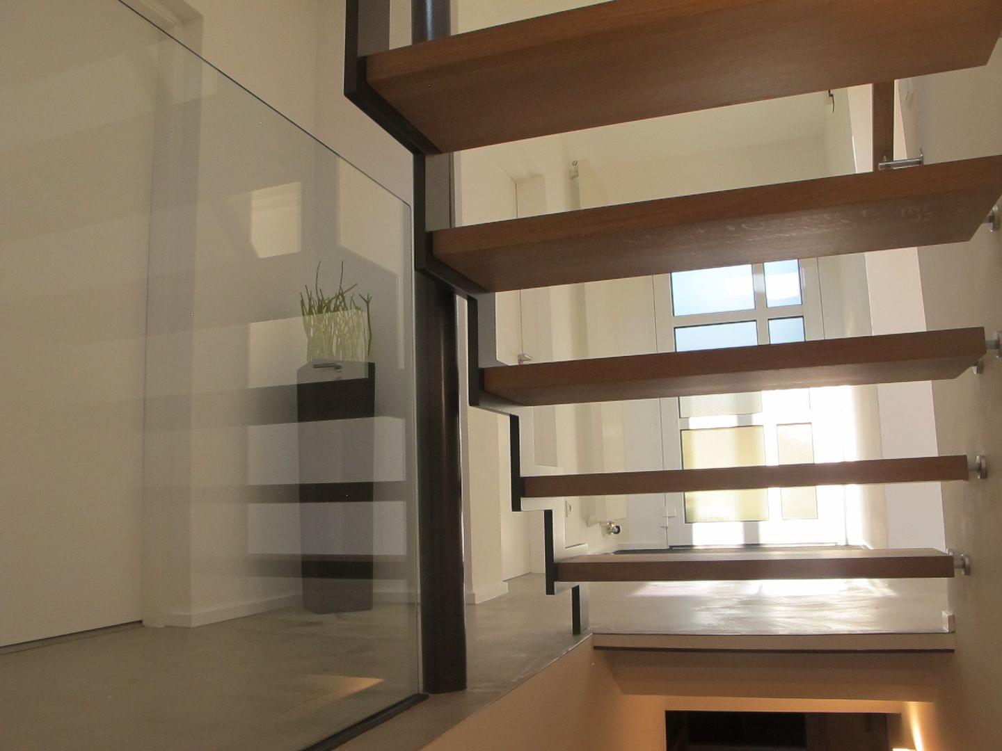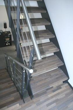 gerade Holz-/Stahltreppe mit Faltwerkwange, Stufen Eiche geölt, Brüstung aus Glas