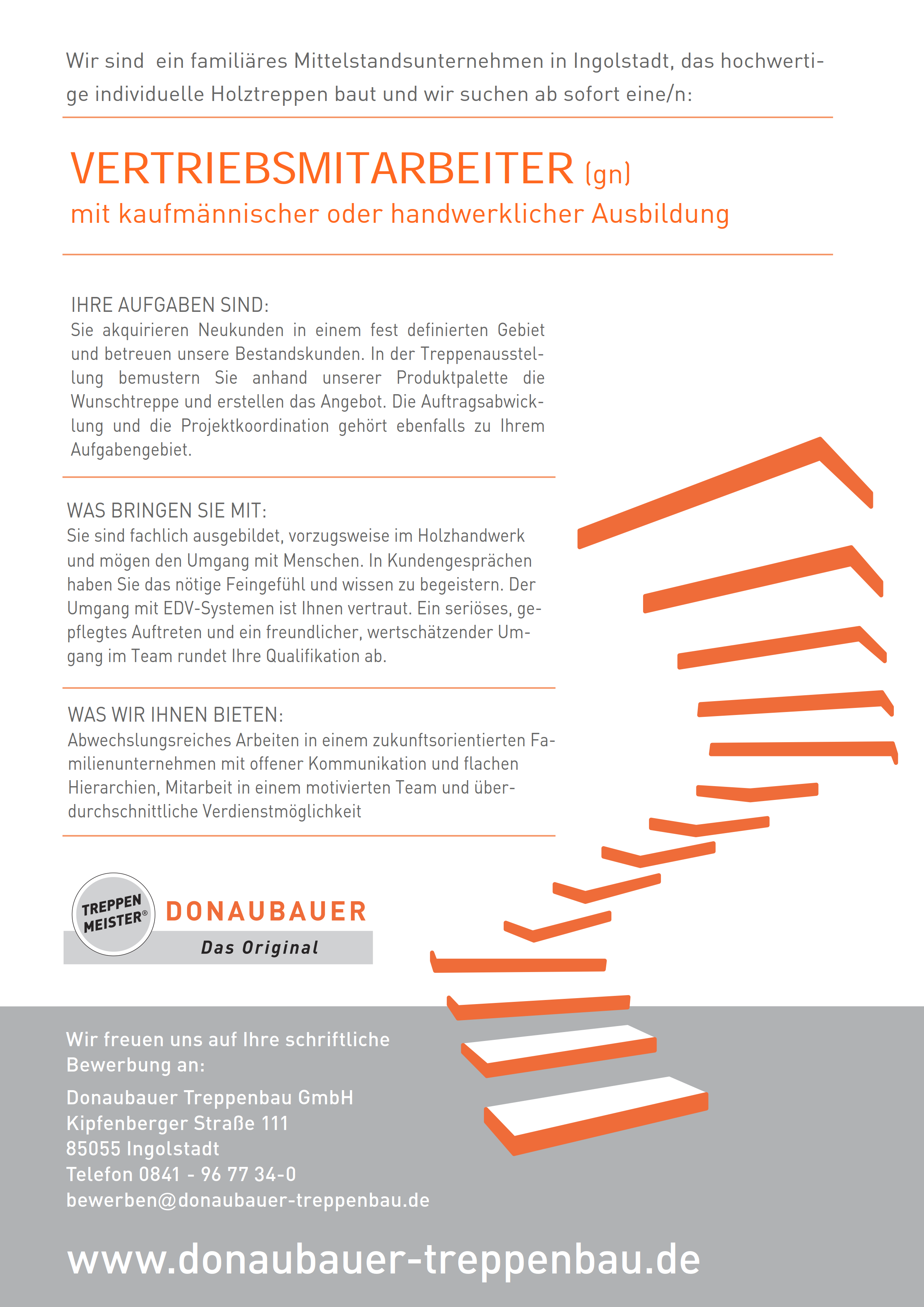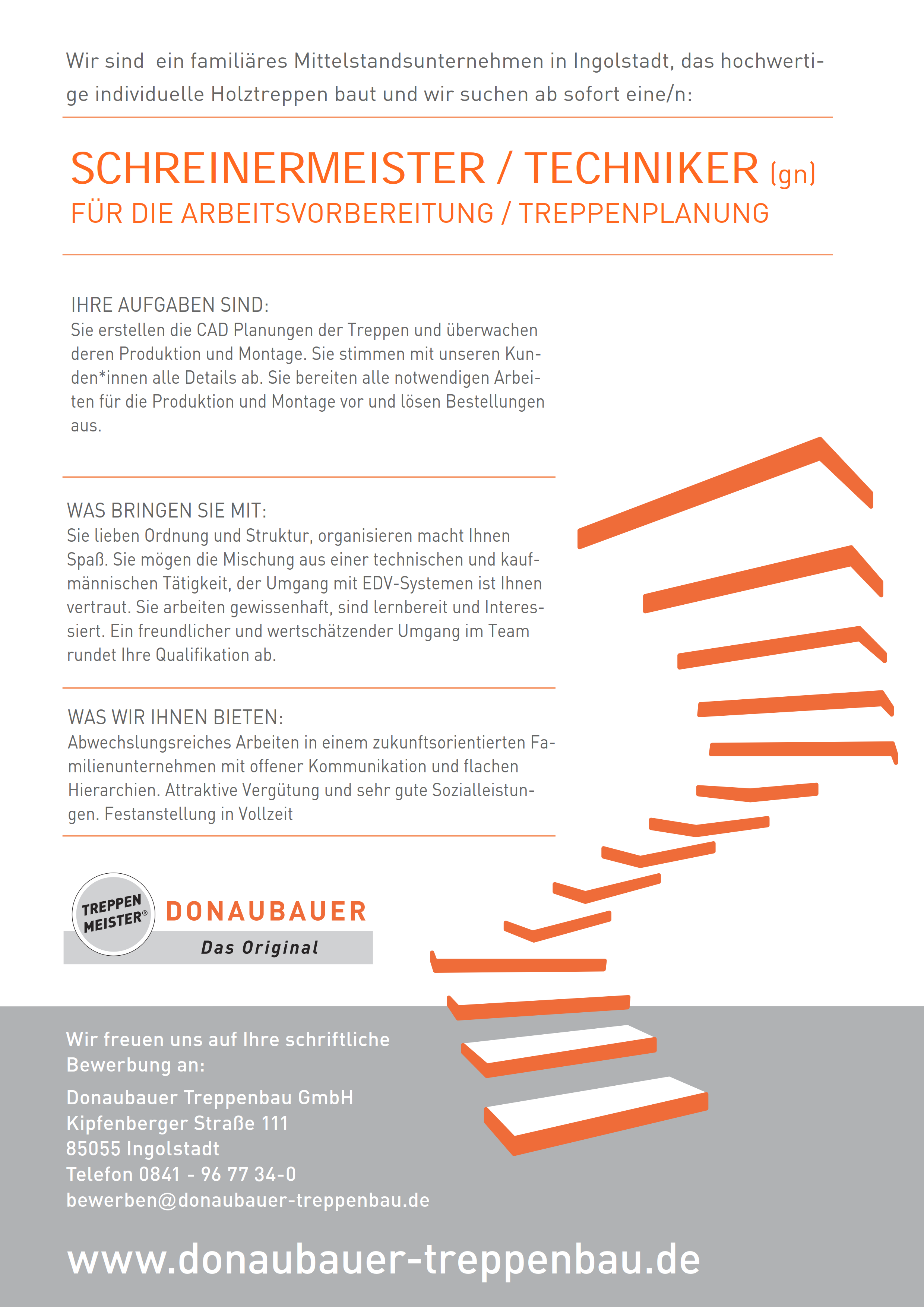 Als führender Treppenbauspezialist in der Region suchen wir motiviertes Fachpersonal, insbesondere Schreiner, Holztechniker und Verkaufsberater für unsere Treppen. Schauen Sie sich unsere ausführlichen Stellenausschreibungen an und bewerben Sie sich.